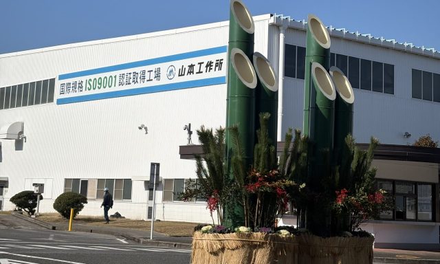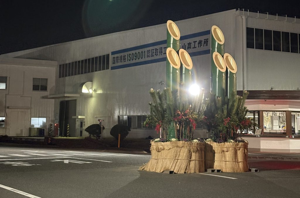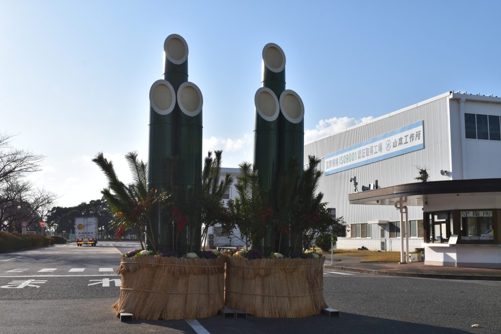 2025年12月18日、本社正門に「ドラム缶巨大門松」を設置しました。複数のドラム缶をつなぎ合わせ、緑色に塗装することにより竹に見立てています。