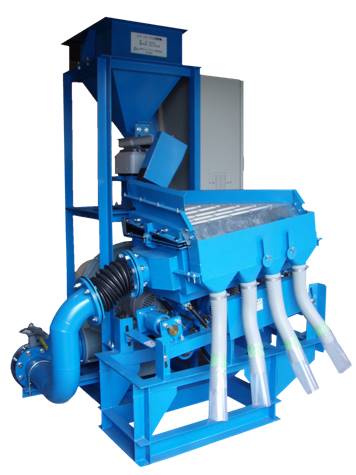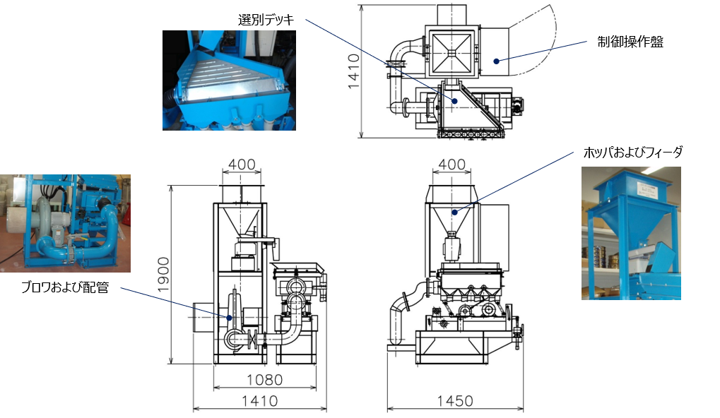 下部からの送風と振動の作用で選別する乾式比重分離装置です。