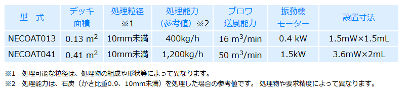 多孔性のデッキを左右に往復振動させ、その底部から送風することにより粒子を選別する乾式比重分離装置です。