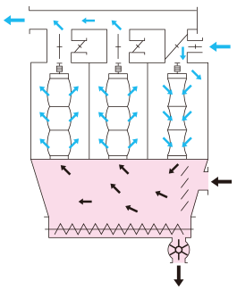 払い落しは、排気逆圧ダンバの開閉により、自然に大気がろ布外面より内面へ流れます。