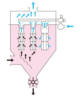 ろ布上部に取付けられたノズルより圧縮空気を噴射し、払い落しを行います。