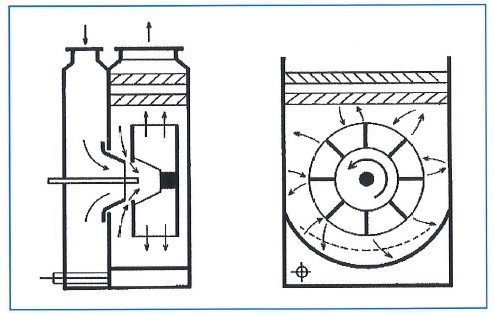 ファン室底部の二重構造の作用で、洗浄水を内部で循環させることにより洗浄水量が増加するので、給水量は少なくても十分なガス洗浄と吸収が行われます。